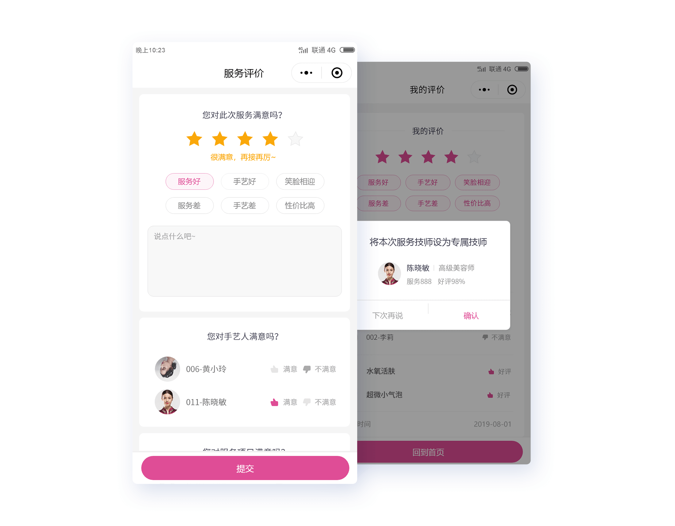 客户在线支付后,立即评价;服务满意的技师可设置为专属技师,并直接影响提成收入。