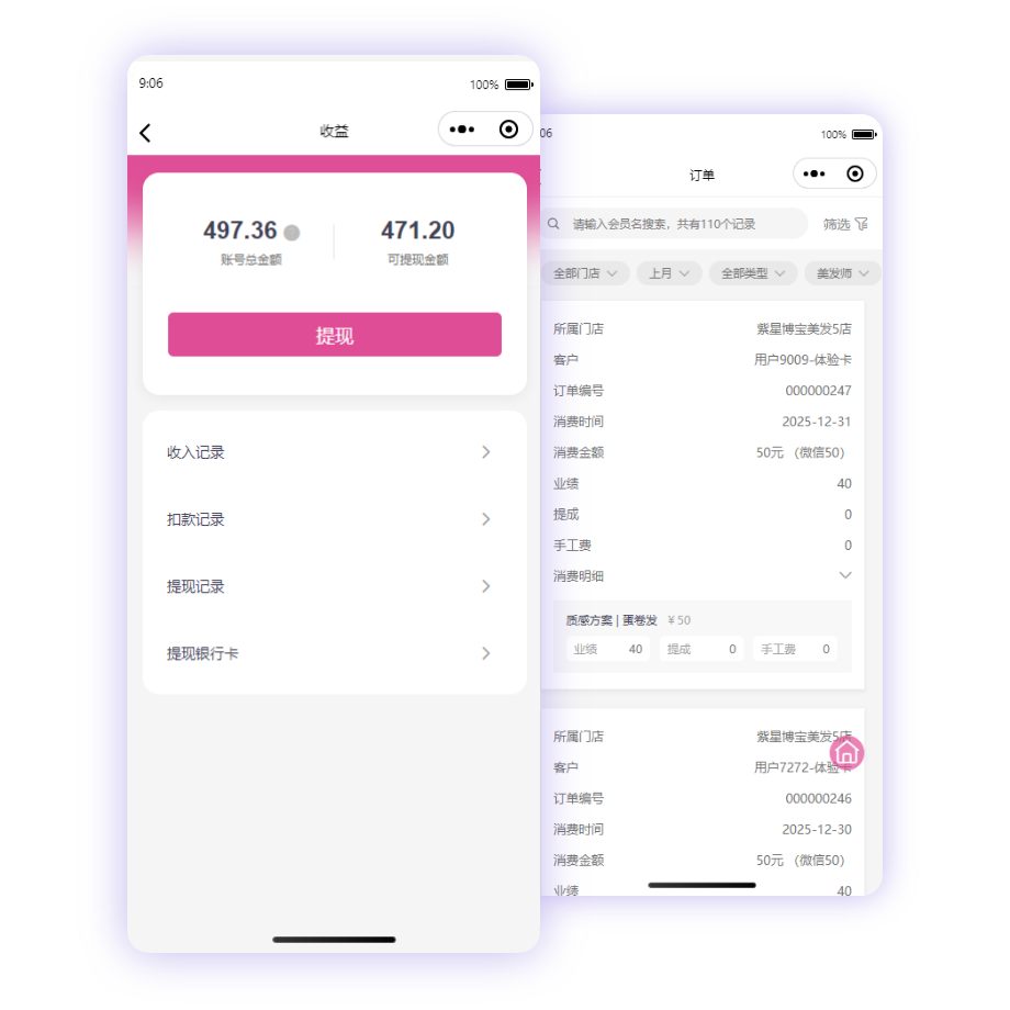订单收益实时核算至技师个人账户,支持随时在线提现。