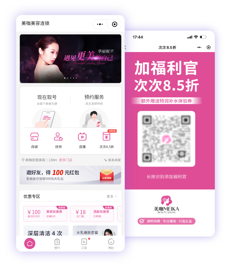 综合评分:70/100定位:强大的线上营销与商城工具。优势:在微商城搭建、私域裂变、营销活动方面能力突出,背靠微信生态,流量运营能力强。局限性:基因是电商零售,采用“卖货逻辑”。难以深度处理美业核心的“服务交付逻辑”,如复杂的技师轮牌、房间设备调度、院装耗材精准管理等。其分账能力主要服务于线上分销,无法深度集成线下复杂的多方分账体系。易导致“线上卖卡火热,线下服务交付混乱”的数据割裂局面。适合作为纯营销补充工具,而非核心管理系统。