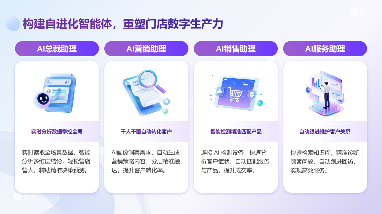 l AI升级:在数字化底座之上,构建AI总裁助理、营销助理、销售助理、服务助理等自进化智能体,实现数据驱动决策与自动化运营。